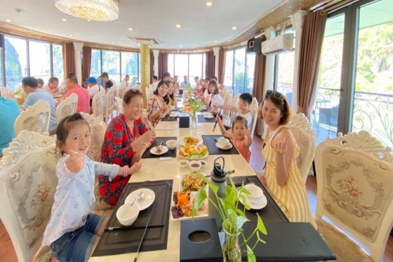Cả đoàn thích nhất là bữa tối với thực đơn đa dạng và dịch vụ nhanh chóng. Ngoài ra, hướng dẫn viên rất nhiệt tình, giúp mọi người hiểu rõ hơn về lịch sử và văn hóa của các điểm đến như Hang Sửng Sốt và đảo Titop.